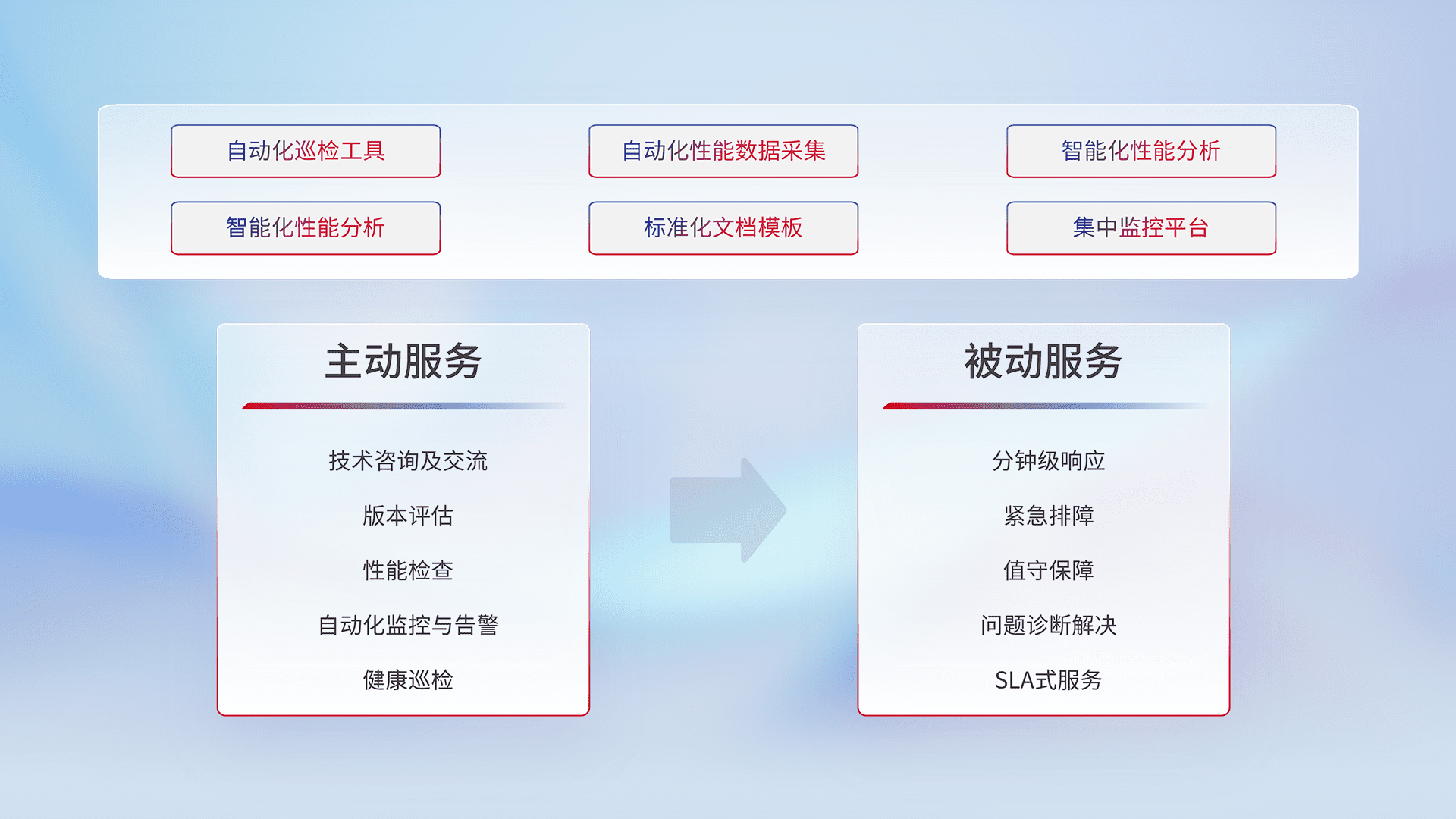 智能化工具和标准化文档,,,保障服务质量,,,,提供主动服务(包含技术咨询、、、、版本评估、、性能检查、、、、自动化监控与告警、、健康巡检)和被动服务包含(分钟级响应、、、、紧急排障、、值守保障、、问题诊断解决、、、SLA服务)。。。。